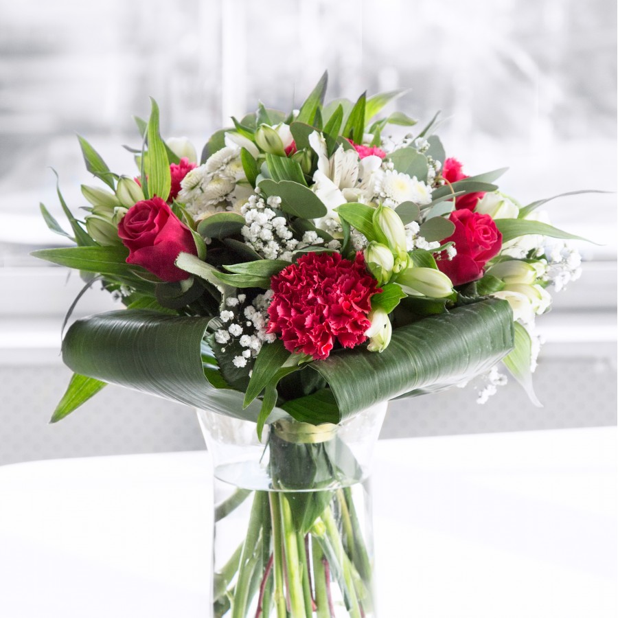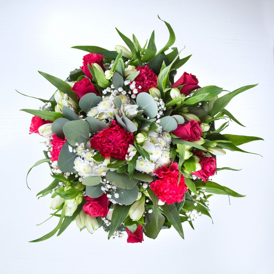 Enhance your surroundings with our unique bouquet, a graceful combination of colors and textures. This stunning arrangement features white chrysanthemums, delicate gypsophila, and striking red roses, complemented by vibrant carnations.