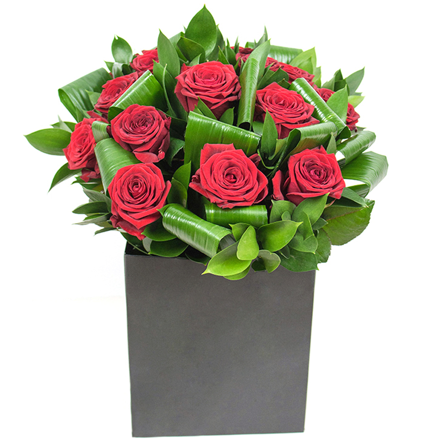 Enchant your space with our luxurious bouquet, featuring deep red roses, vibrant aspidistra leaves, and delicate ruscus. This sophisticated arrangement is designed to bring both beauty and elegance to any environment.