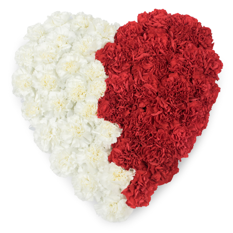 Brighten someone's day with our heart-shaped carnation bouquet, featuring a vibrant mix of white and red carnations. Each bloom is carefully hand-picked for maximum freshness and lasting beauty.