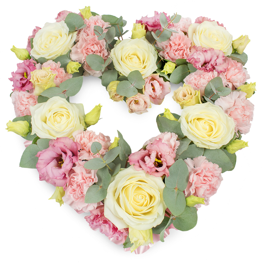 Honor a cherished memory with this exquisite bouquet that symbolizes both grace and enduring love. Featuring gorgeous white roses, charming pink carnations, and soft pink lisianthus, this arrangement is enhanced with natural eucalyptus leaves to create a visually captivating display.